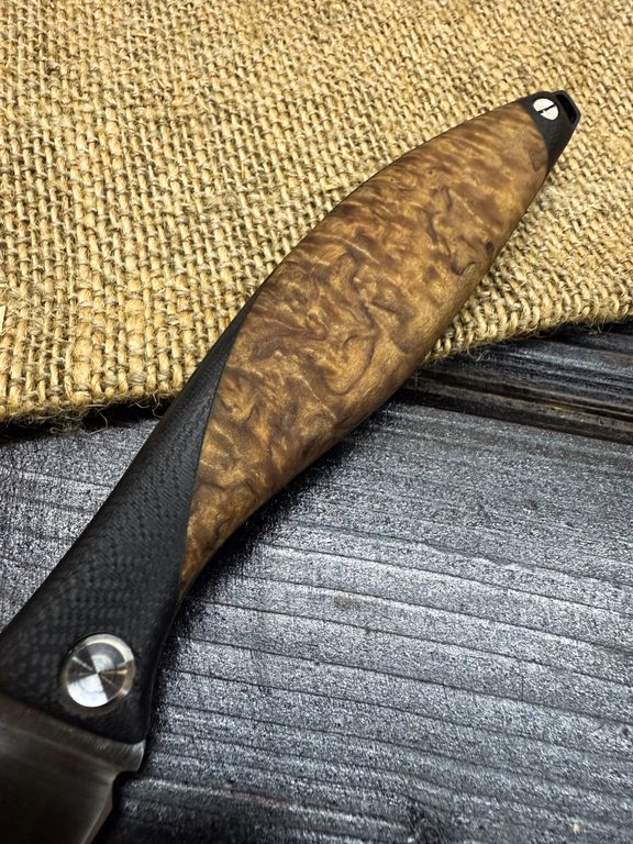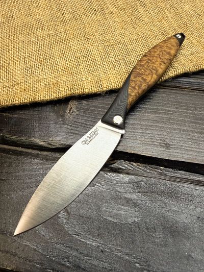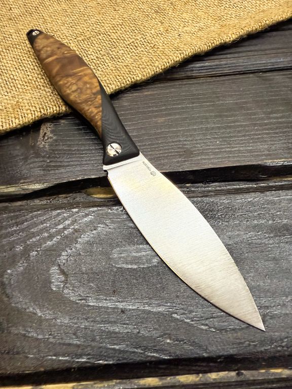 Для клинков мы используем высококачественные стали как доступного, так и премиального сегмента: Bohler K110, AUS-10, VG-10, Elmax, авторский ламинат Леонида Васильева.