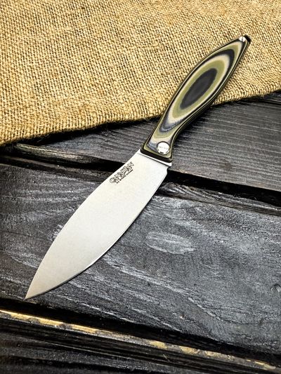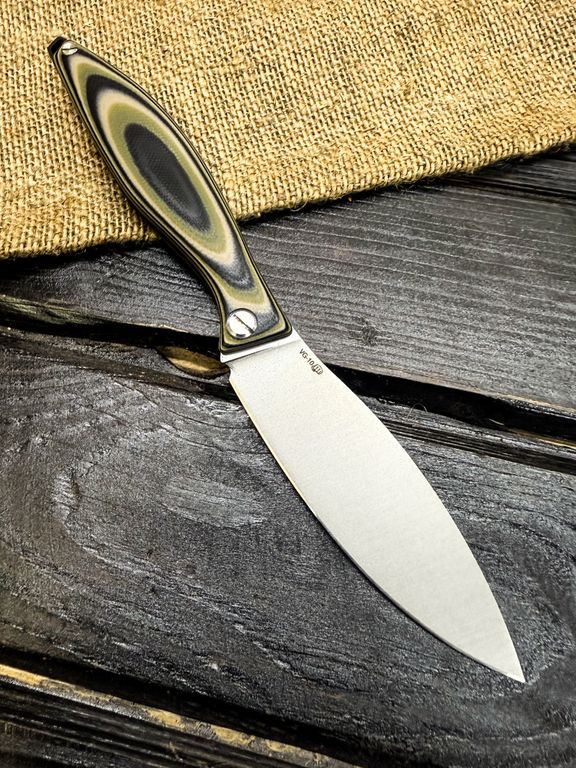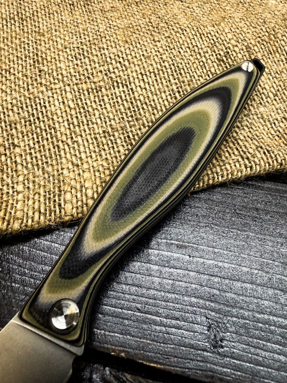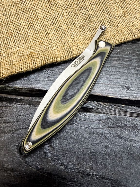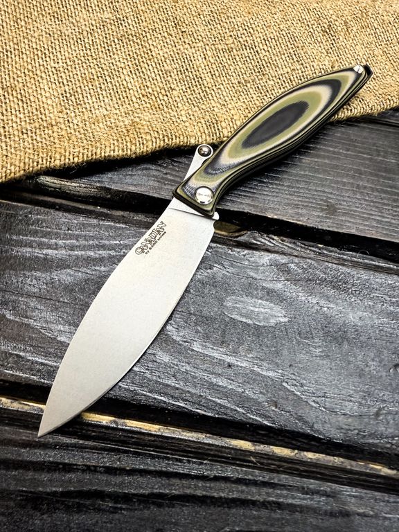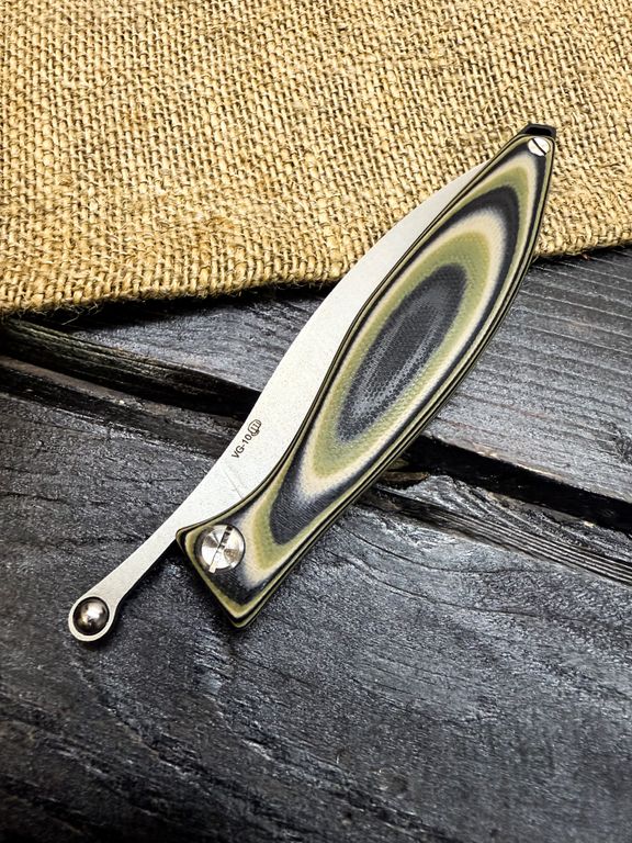 Лёгкий городской складной нож сочетает в себе инновационные решения: надежный замок клик-лок, 3D накладки из цветного G10 или хаотичного карбона, осевой винт собственной разработки, конструкция на латунных шайбах.
