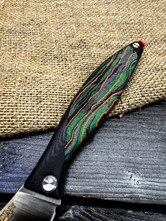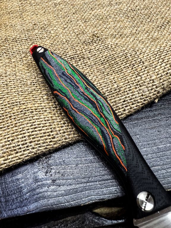 Лёгкий городской складной нож сочетает в себе инновационные решения: надежный замок клик-лок, 3D накладки из цветного G10 или хаотичного карбона, осевой винт собственной разработки, конструкция на латунных шайбах.