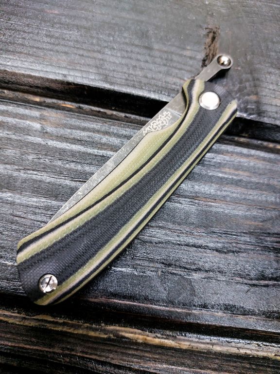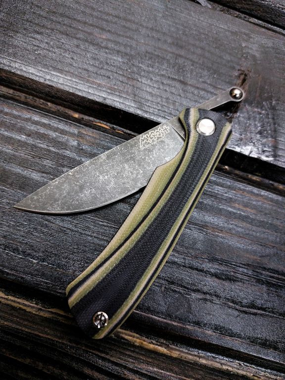 Лёгкий городской складной нож сочетает в себе инновационные решения: надежный замок клик-лок, 3D накладки из цветного G10 или хаотичного карбона, осевой винт собственной разработки, конструкция на латунных шайбах.