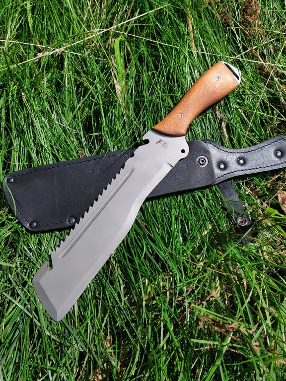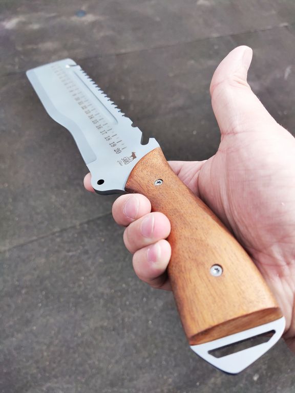 Вязкая сталь 65Х13 обеспечивает прочность при рубке, легко затачивается даже в походных условиях. Серрейтор позволяет применять Экспедиционный в качестве пилы.