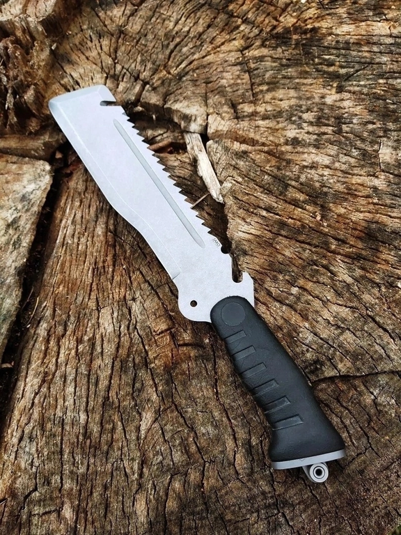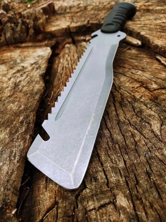 Вязкая сталь 65Х13 обеспечивает прочность при рубке, легко затачивается даже в походных условиях. Серрейтор позволяет применять Экспедиционный в качестве пилы.