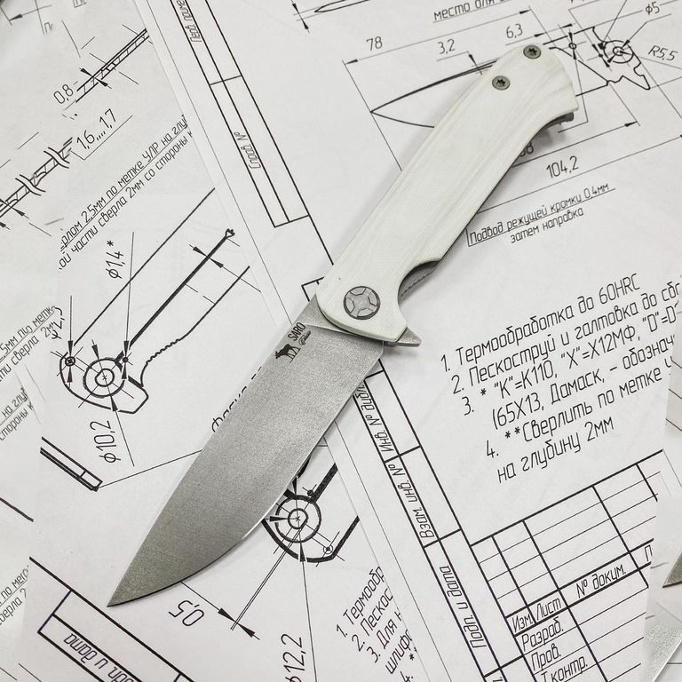 Для клинков мы используем высококачественные стали, как доступного, так и премиального сегмента: 65Г, Bohler K110, AUS-10, Elmax, авторский ламинат Леонида Васильева, дамасская сталь (350 слоев в пакете (ХВГ, 65Г, Х12МФ, У8).