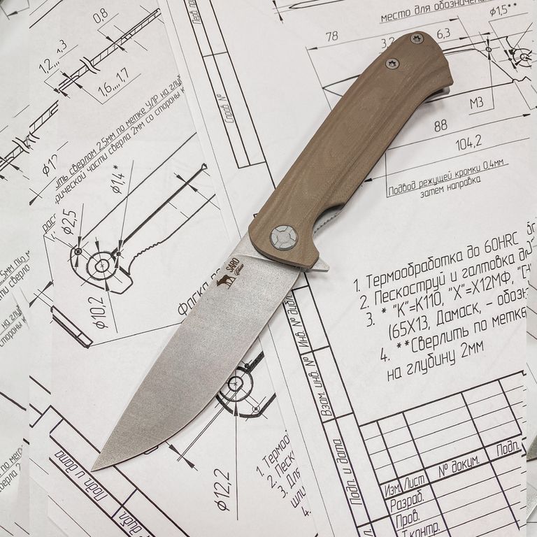 Для клинков мы используем высококачественные стали, как доступного, так и премиального сегмента: 65Г, Bohler K110, AUS-10, Elmax, авторский ламинат Леонида Васильева, дамасская сталь (350 слоев в пакете (ХВГ, 65Г, Х12МФ, У8).