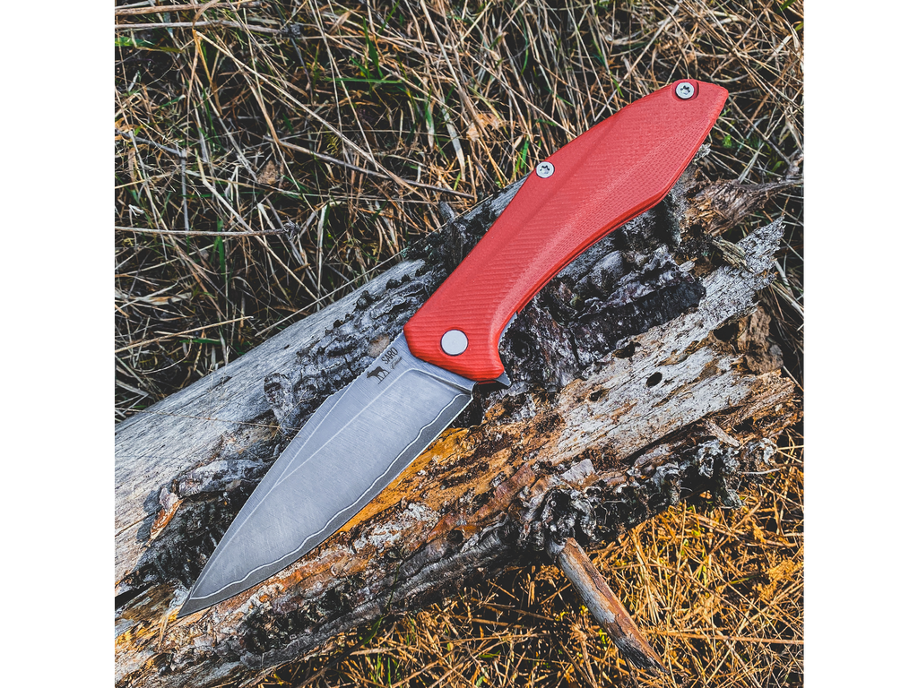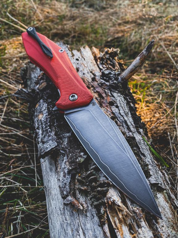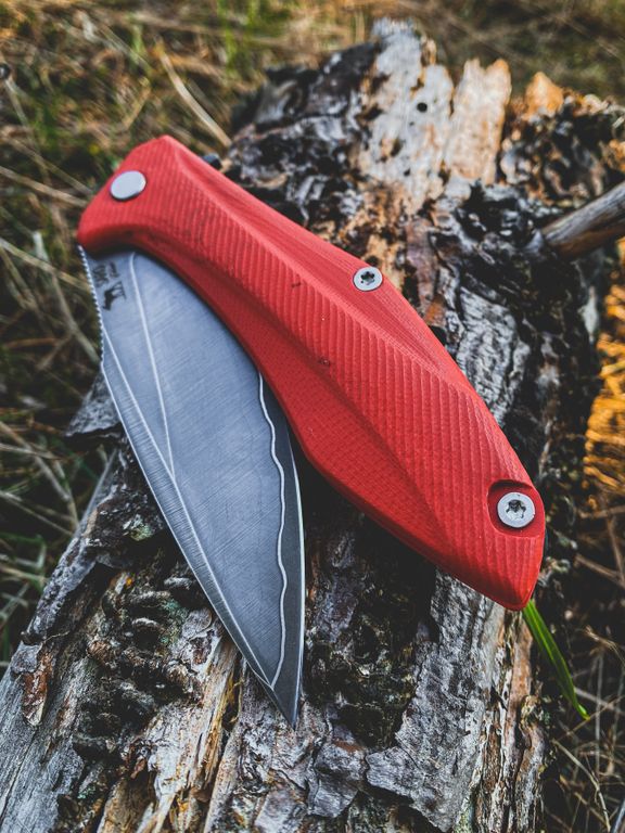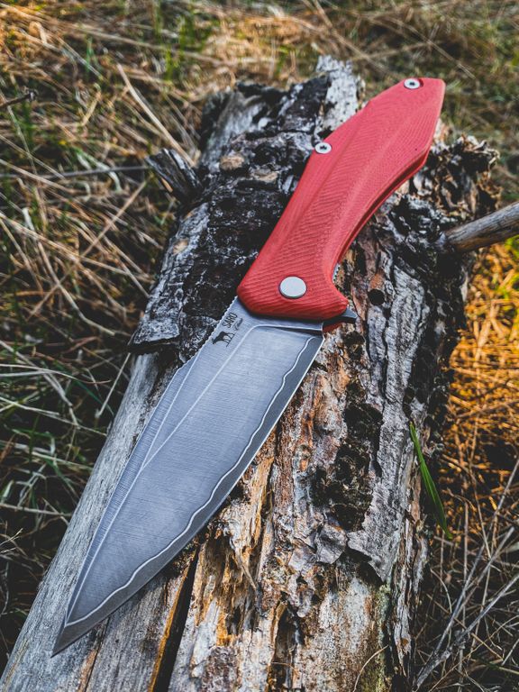 Ножи серии "Грач" воплощают в себе инновационные технические решения, авторский нетривиальный дизайн Тараса Телегина и общую стремительность форм. При проектировании этого ножа учитывался не только внешний вид, но и эргономика. Все металлические части рукояти спрятаны в высокоточные выфрезерованные пазы в накладках, благодаря чему нож приятно ощущается в руках даже при отрицательных температурах. Проектируя клипсу мы подумали и о левшах. Клипсу из G10 без проблем можно переместить на удобную сторону. Для создания клинков мы используем такие материалы как ламинат от Леонида Васильева, D2, AUS-10, а так же применяем криогенную обработку.